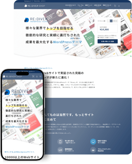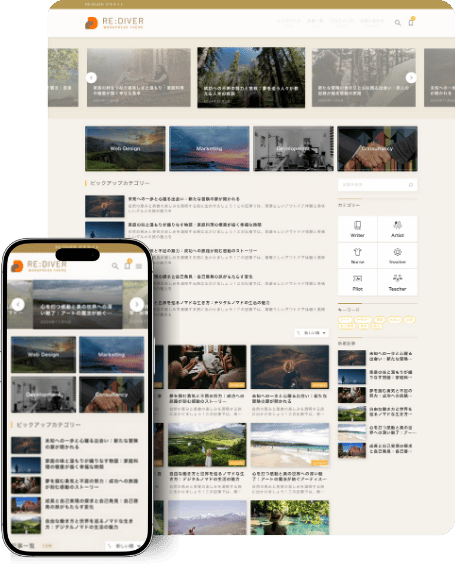 10000以上のWebサイトで絶大な信頼を得てきたWordPressテーマ「Diver」が、さらなる進化を遂げて「RE:DIVER」として生まれ変わりました。デザイン、機能、パフォーマンスのすべてが大幅にパワーアップし、あなたのWebサイトを次のレベルへと導きます。「RE:DIVER」で、何ランクも上のサイト運営を体験してください!