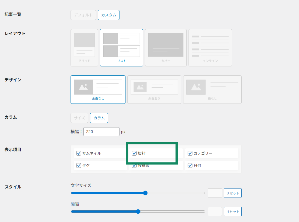 【カテゴリーを編集】で記事一覧をカスタムにしたとき抜粋をチェックしても表示されない。