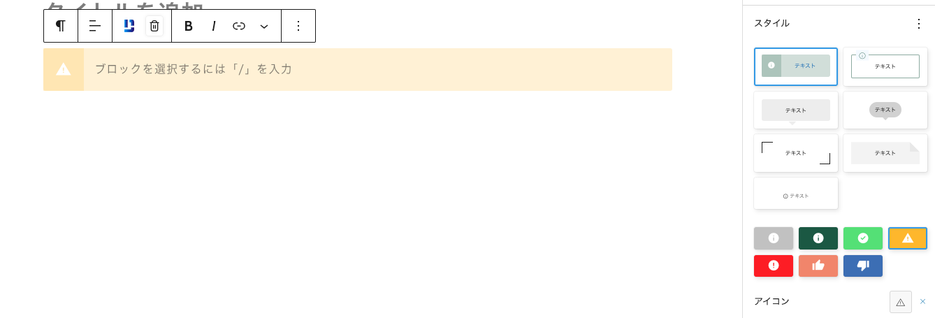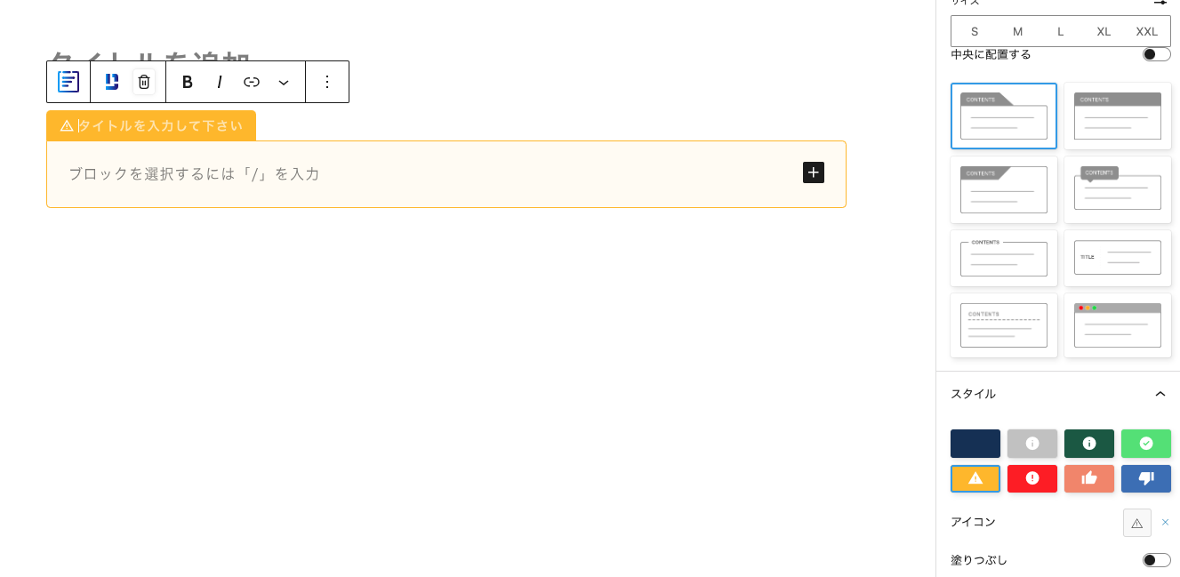 警告ボックスを追加してほしいクローズ機能リクエスト / 改善提案2025年8月22日 6:28 PM1ヶ月2週前 vk blockの警告ボックスのようなアイコンを追加して強調表示できるようなボックスを追加してほしいです 2件の返信を表示中 - 1 - 2件目 (全2件中) 投稿者 返信 REDIVER タカギ 2025年8月23日 5:30 PM #63611 Diver Blocksでは、段落ブロック(通常のテキスト入力)でアラートのスタイルを選択することができます。アイコンやカラーは自由に調整可能です。 中にテキスト以外のブロックを設置したい場合には、囲い枠ブロックを利用してみてください。こちらもデザインは自由に調整可能です。 もし既存のデザインではなくカスタマイズしたデザインを利用したい場合には、プリセット機能を利用していただければ設定したデザインをすぐに呼び出すこともできます。 https://re-diver.com/manual/diver-blocks/preset/ Furumatsu Keita 2025年8月23日 7:03 PM #63613 できました! ありがとうございます 投稿者 返信 2件の返信を表示中 - 1 - 2件目 (全2件中) トピック「警告ボックスを追加してほしい」には新しい返信をつけることはできません。