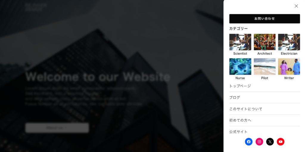 ウィジェットエリア > ドロワーメニューに 設置されているウィジェットが表示されます。ウィジェットが空の場合には、ボタンも表示されません。