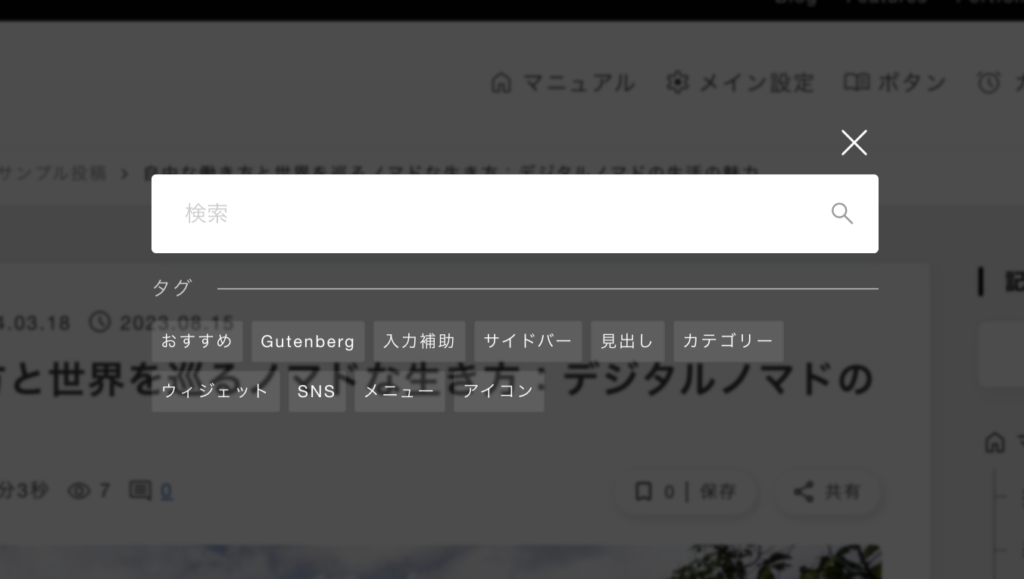 ウィジェットエリア > 検索ポップアップに 設置されているウィジェットが表示されます。ウィジェットが空の場合には、検索ボックスと関連キーワードが表示されます。