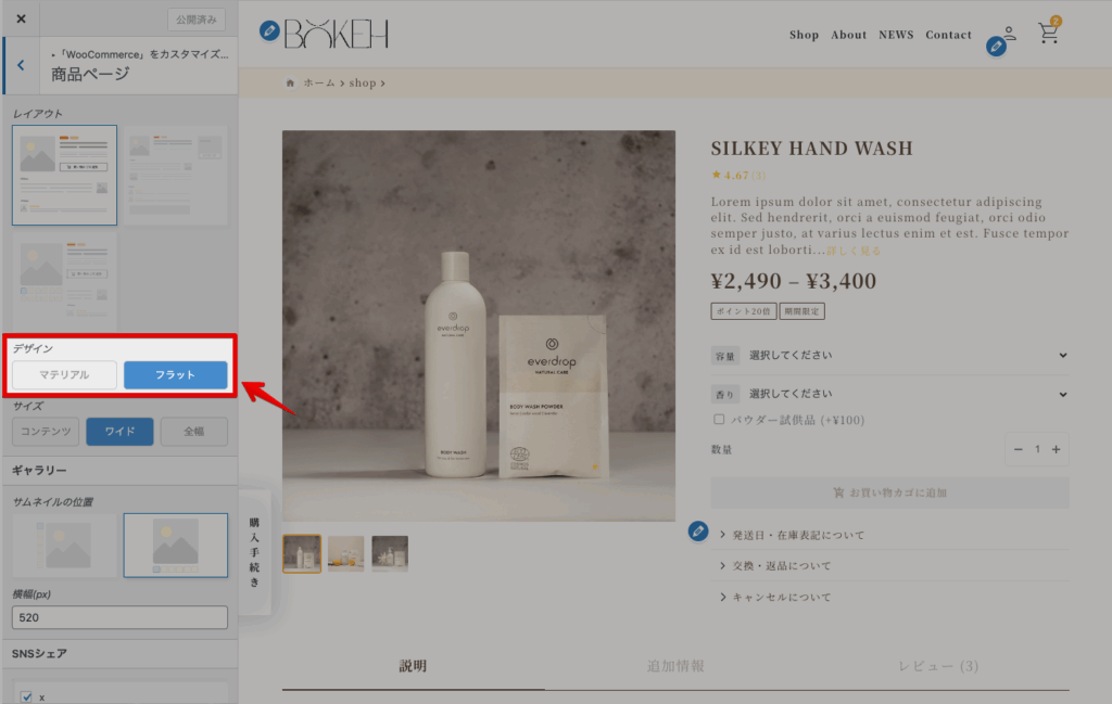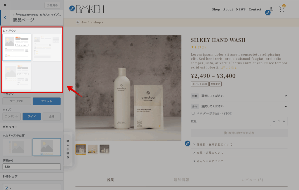 カスタマイザー > Woocommerce > 商品ページ
