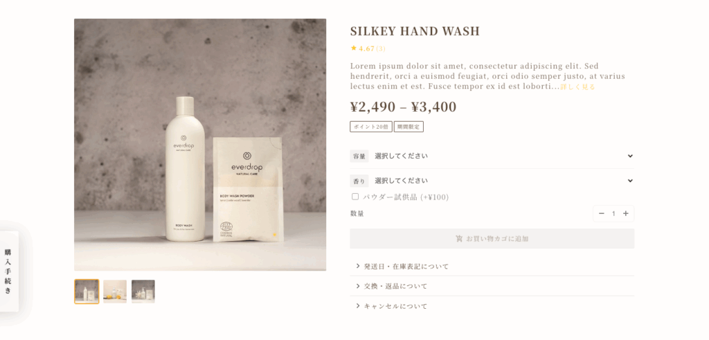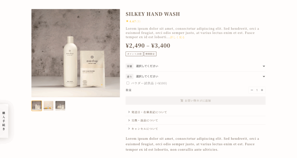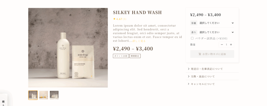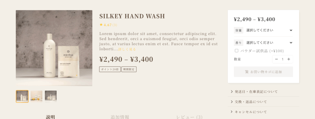 ギャラリーの横に全ての商品情報が表示されます。