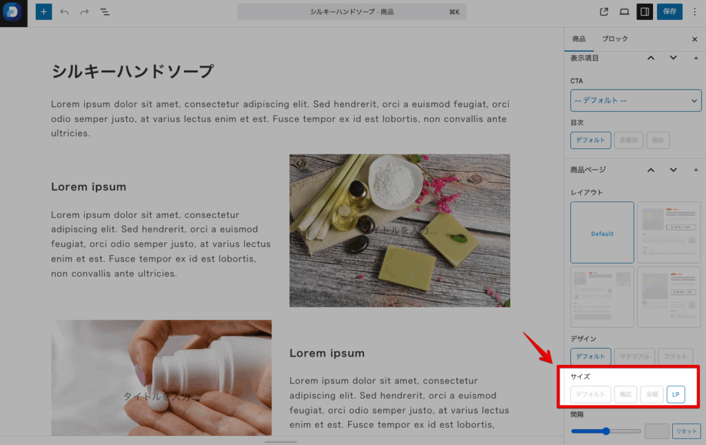 を選択していただくと、商品ページにコンテンツ以外の情報が表示されずにLP風の商品ページを作成することができます。