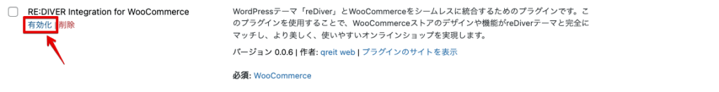 ❶Woocommerceを有効化した後に、❷RE:DIVER Integration for Woocommerceを有効化してください。